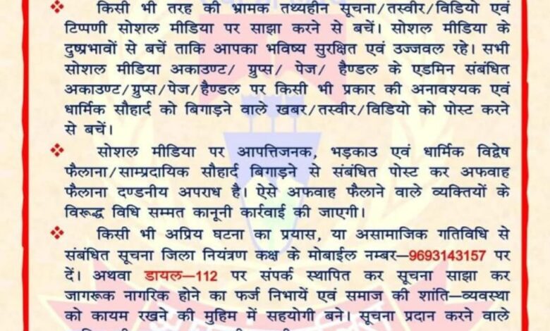рд╕реЛрд╢рд▓ рдореАрдбрд┐рдпрд╛ рдкрд░ рдЕрдлрд╡рд╛рд╣, рдЖрдкрддреНрддрд┐рдЬрдирдХ рдкреЛрд╕реНрдЯ, рдзрд╛рд░реНрдорд┐рдХ рдЙрдХрд╕рд╛рд╡реЗ рд╡рд╛рд▓реА рддрд╕реНрд╡реАрд░/рд╡реАрдбрд┐рдпреЛ рд╕рд╛рдЭрд╛ рдХрд░рдиреЗ рд╕реЗ рдкрд░рд╣реЗрдЬрд╝ рдХрд░реЗрдВред